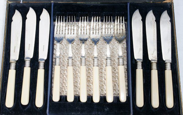 CELLULOID ENGRAVED KNIVES, FORKS FISH SET,