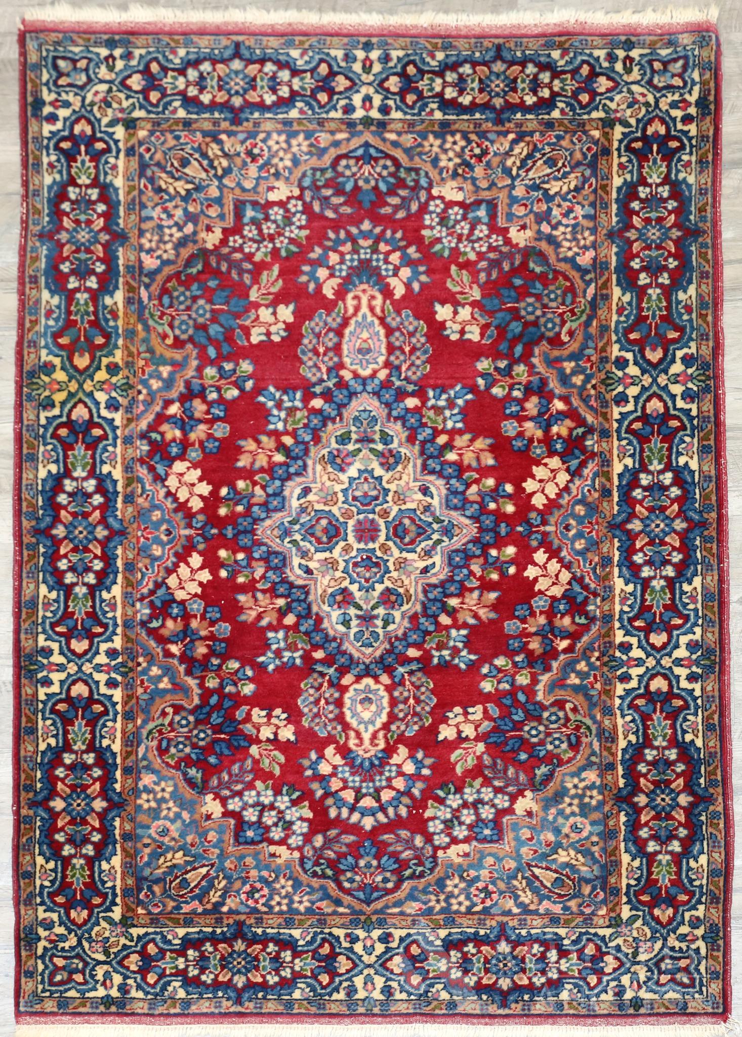 SoldHandwoven Persian Area RugHandwoven Persian Area RugCentral medallion in shades of blue, ivory and pink on a red field with floral and ivory spandrels framed by a blue floral filled primary border and guard borders.4' 4"See Sold Price
