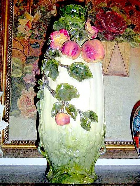 SoldCeramic Vase with Majolica Strawberry VinesCeramic gray Vase with Majolic White Strawberry Vines and gold accents. Approx. 13 inches tall x 5.5 wide x 5 deep, Approx.2.14 lbs.See Sold Price