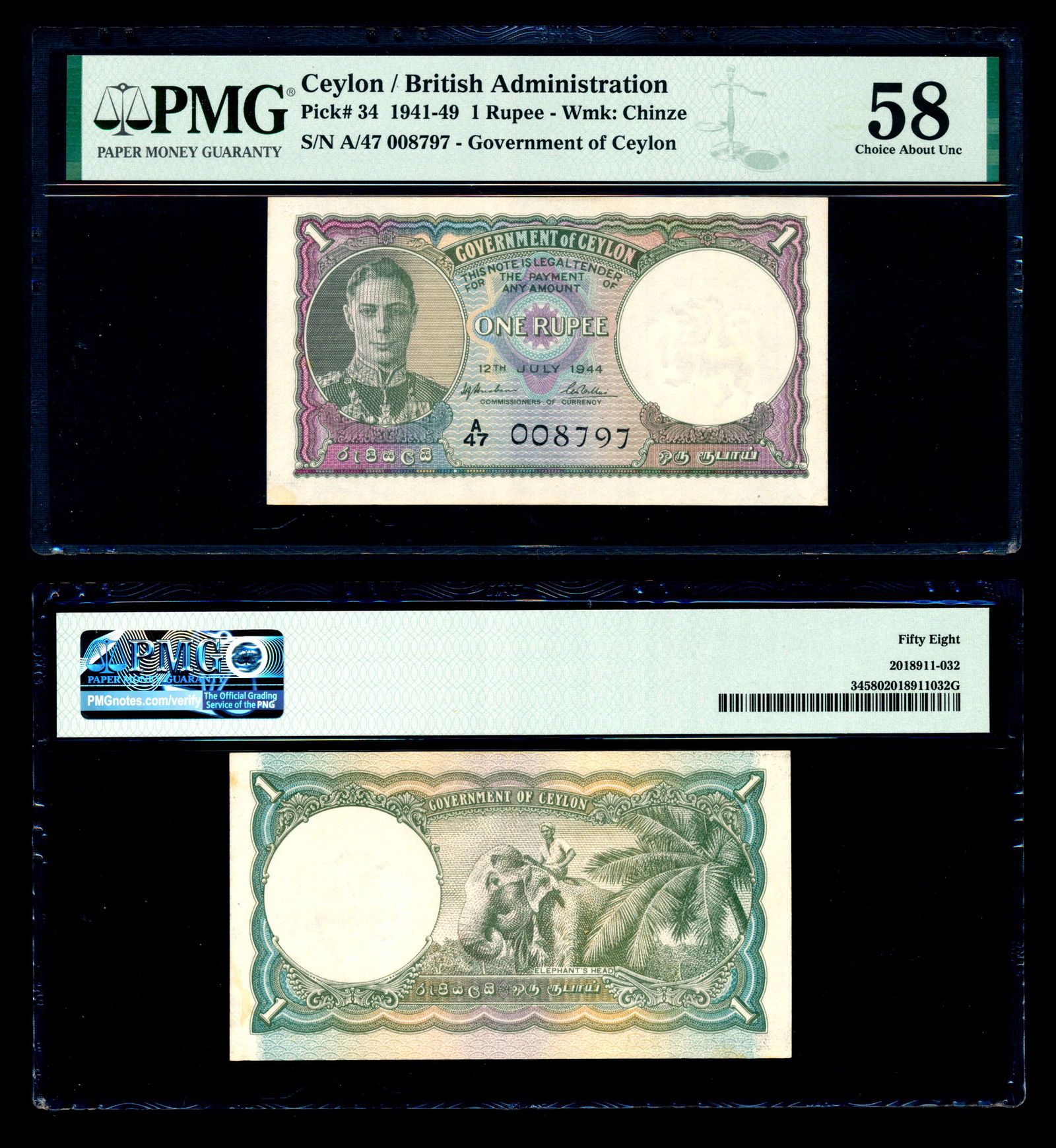 Ceylon 1 Rupee 1944 KGVI PMG