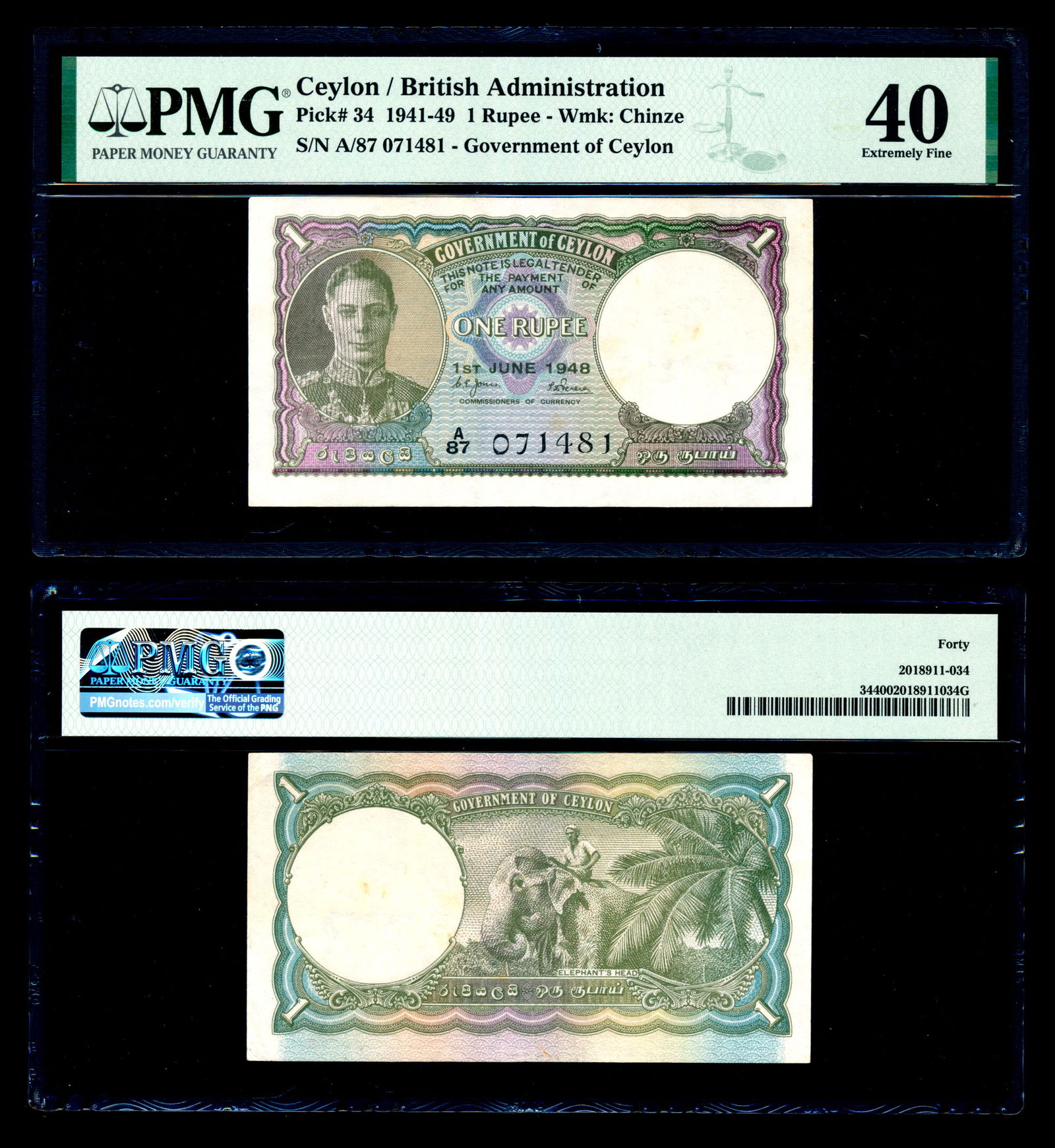 Ceylon 1 Rupee 1948 KGVI PMG