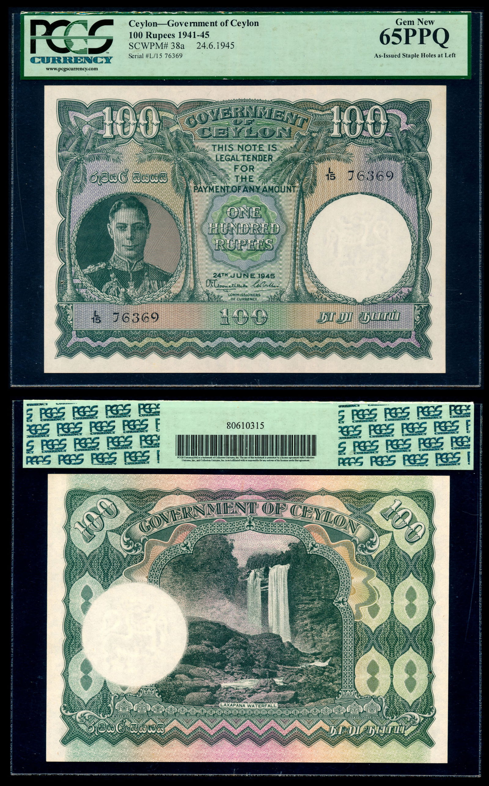 Ceylon 100 Rupees 1945 KGVI PCGS