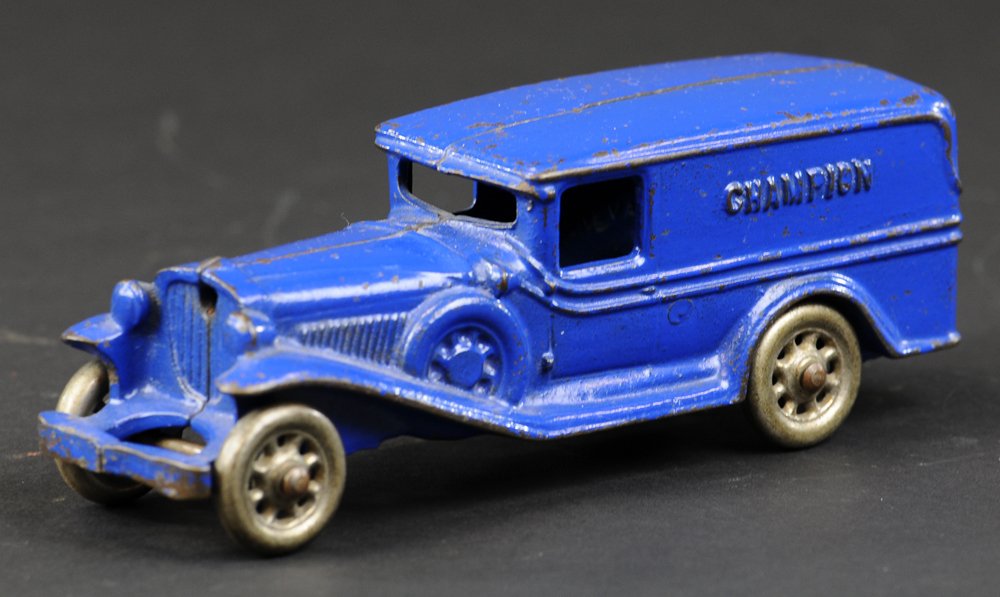 SoldBlue Champion Panel Side Van Cast IronLarge Chapion panel side truck/delivery van. Great lettering cast in reading 'CHAMPION' and steel wheels. Nice cast in spar tires. Left front bumper repaired. 7-3/4" long.See Sold Price