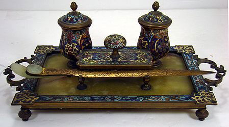 CHAMPLEVE ENAMEL AND ONYX INKWELL SET