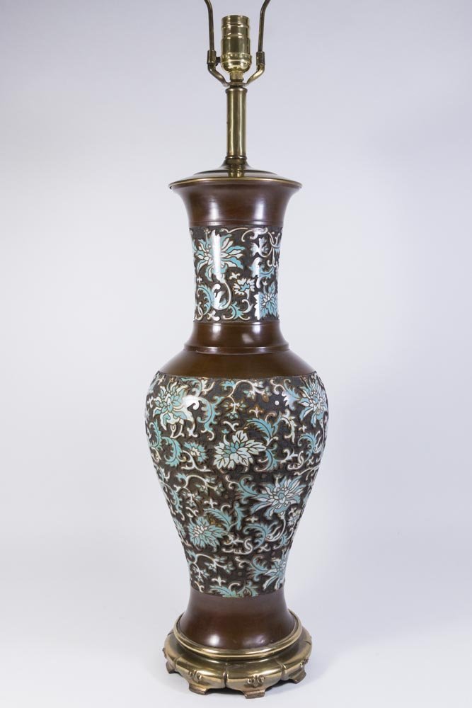 SoldJapanese Bronze Champleve Vase Table LampJapanese bronze champleve double handled vase, mounted as table lamp, 12-3/4" to top of vase, 23-1/2" h overallSee Sold Price