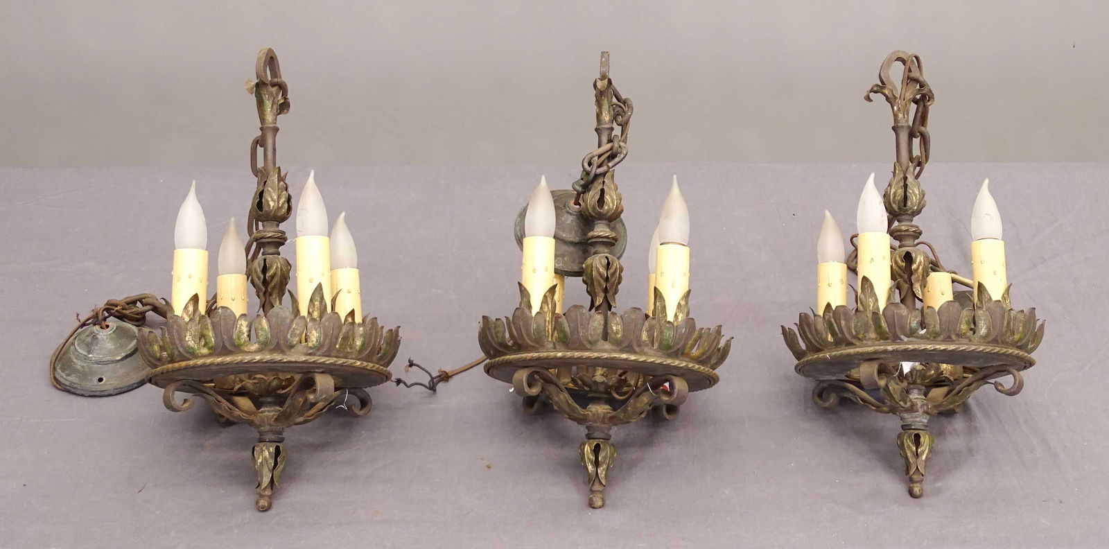 SoldAmerican Aesthetic Movement ChandeliersPair (2) of American Aesthetic Movement brass and copper four-arm prism-hung chandeliers, 19th c. Chandeliers exhibit repairs and chips to two of the globes, one center bottom ball prism is broken aloSee Sold Price