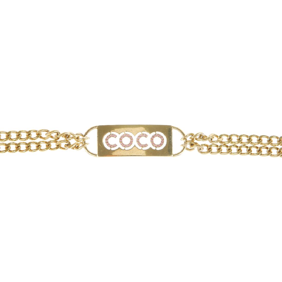 SoldCHANEL - a belt.CHANEL - a belt. The front designed as a rectangular panel, with pink-gem 'Coco' motif, to the connecting and curb-link two-row chain. Signed Chanel. Length 93cms.See Sold Price