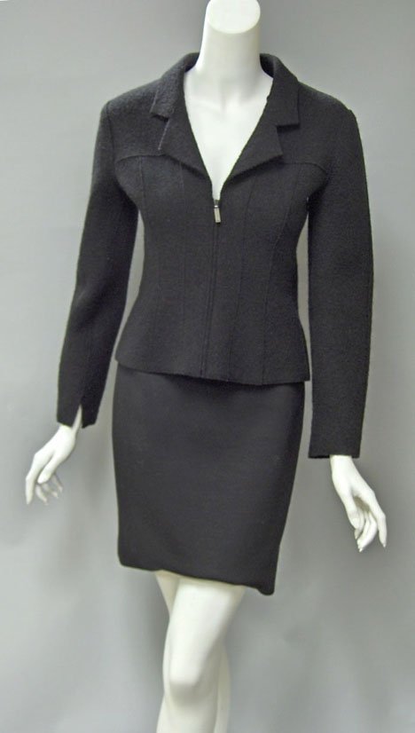 SoldCHANEL BLACK WOOL SKIRT SUITCHANEL BLACK WOOL SKIRT SUIT, SIZE 44:A laine wool and nylon blend jacket and matching skirt. Labeled: Chanel Boutique, made in France, size 44. Fall 1997.See Sold Price