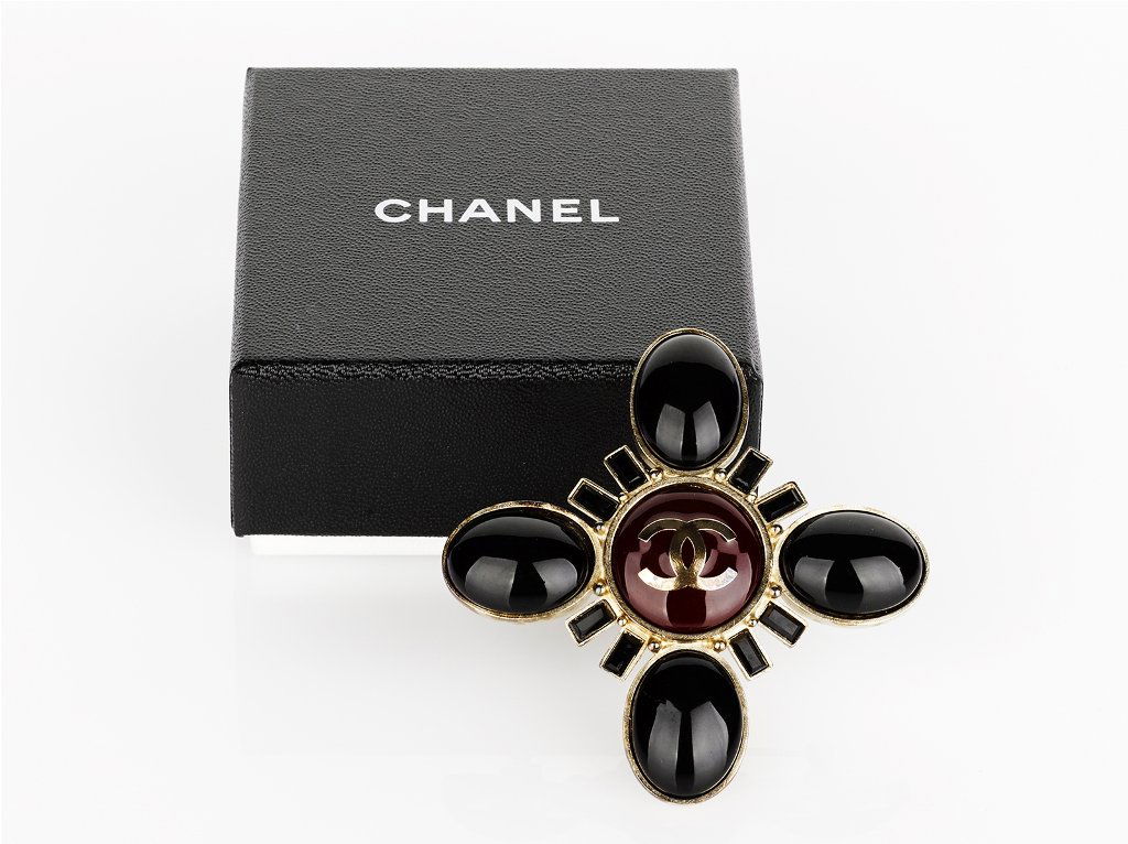 SoldCHANEL Style Interlocking CC Brooch, Chanel BoxChanel style gold tone and clear crystal brooch that comes with a velvet pouch with the Chanel logo and a Chanel Box. Brooch has chevron gold tone pattern with inset black enamel and bezel set crystalSee Sold Price