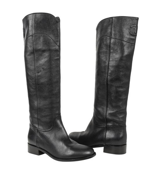 Chanel Boot Black Textured Leather Flat Knee High CC