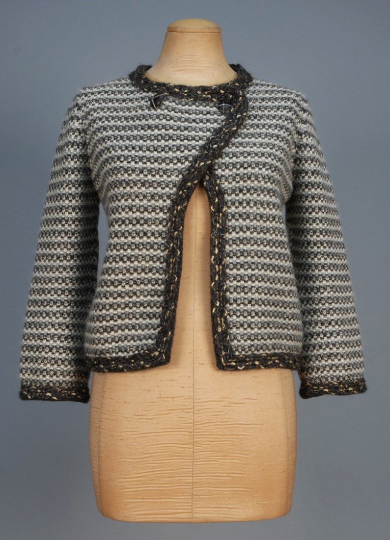 SoldCHANEL CASHMERE SWEATER & WOOL TROUSERS ENSEMBLECHANEL CASHMERE SWEATER & WOOL TROUSERS ENSEMBLE, SIZE 44:Chanel grey trousers with black and tan design. Small back pockets with Chanel emblem buttons. Matching pockets at front. Silk lining. LabeledSee Sold Price