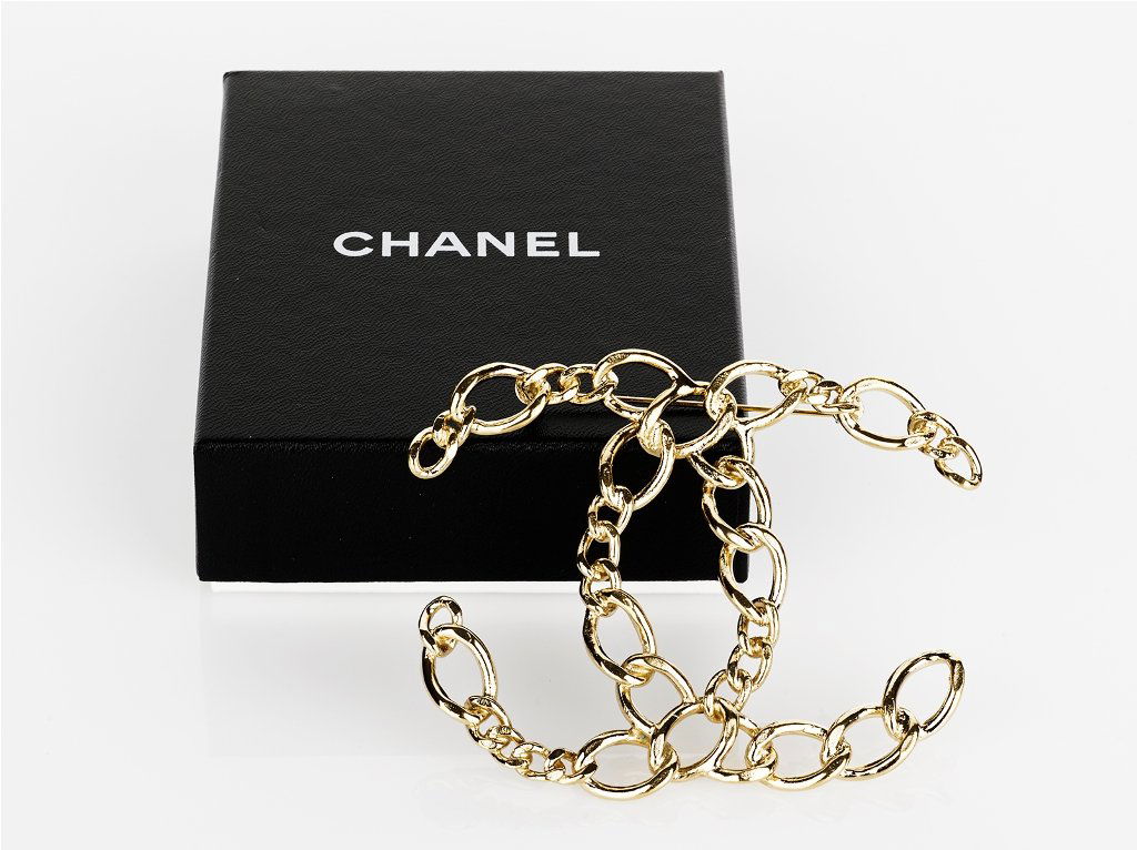 SoldChanel Costume Gold Tone Necklace Brooch LotNecklace/chain is 24 1/2" long and 9mm wide. Pendant - 54mm long wtih bale and 44mm in diameter. Brooch is 64mm x 52mm. Marked: CC logo, Chanel, made in France, 95P. Weight - 152 grams.GemstonesSee Sold Price