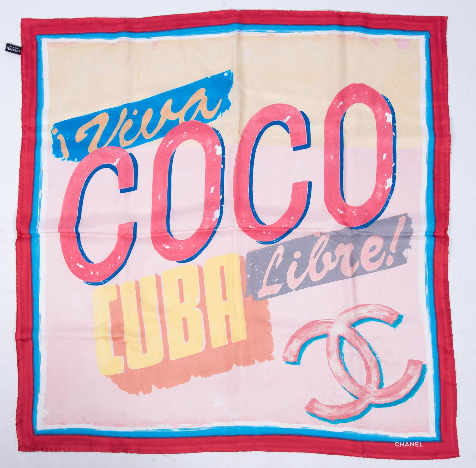 Four Chanel silk scarves. (1) 34" square. New York/Paris travel logos. Red, black and other assortedFour Chanel silk scarves. (1) 34" square. New York/Paris travel logos. Red, black and other assorted colors. (2) 34" square. CoCo Chanel image and logo. Black, white and red. (3) 34" square. Perfumes,