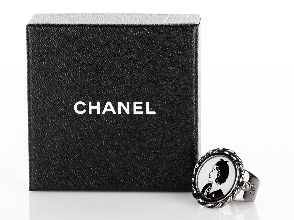 SoldChanel Runway Double-C Logo Ring, 2013Chanel silver-tone metal ring with black enamel signature double-C logo, 2013, marked "(c) CHANEL (R) / B13 CC B / MADE IN ITALY" to reverse. Ring size 5 1/2. Provenance: Property from an Upper East SSee Sold Price