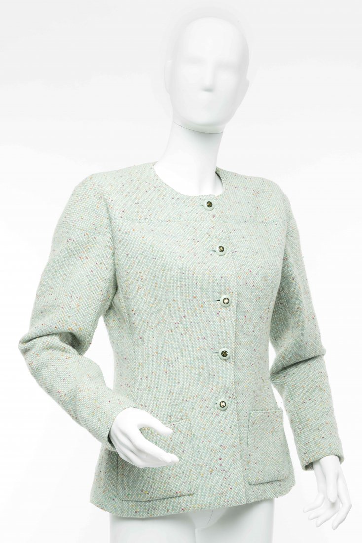 SoldCHANEL: MULTICOLOR PASTEL TWEED JACKET Spring 2005CHANEL: MULTICOLOR PASTEL TWEED JACKET Spring 2005 • Size Marked 42 • Multicolor Cotton-Blend Tweed Jacket with Shamrock Sequin Embellishments and Extended Fabric at Bottom Hemline and CufSee Sold Price