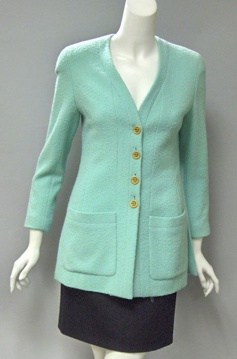 SoldChanel Runway Wool Blend Mint Green Jacket, 2001Chanel Runway Wool Blend Mint Green Jacket, Fall 2001, with CC buttons mint and gold tone buttons, two front pockets and CC silk lining, with "Chanel / Made in France / 01A" label. Full length: 25.5",See Sold Price