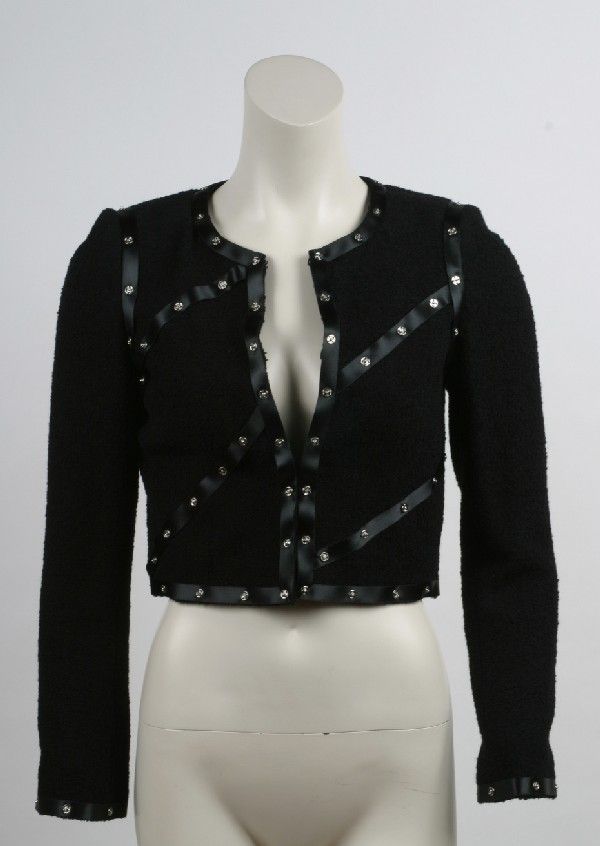 SoldChanel Jacket, Fall 2000 Chanel Jacket, Fall 2000 Collarless, snap-front jacket in wool-blend boucle with black, braided cord trim at borders and hemlines. Jacket is fully-lined in tonal silk charmeuse with four patch pockeSee Sold Price