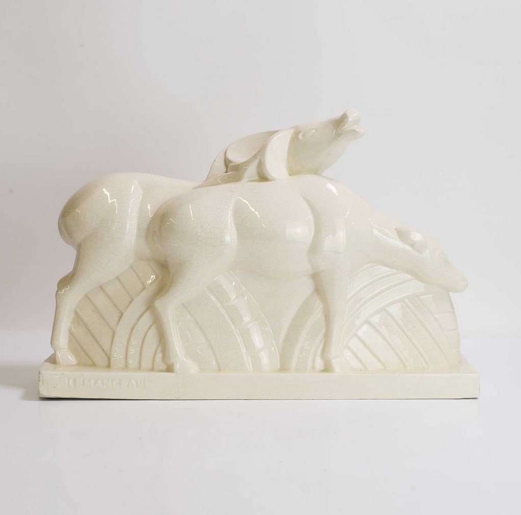 SoldCharles LEMANCEAU (1905-1980) a ceramic art deco statueCharles LEMANCEAU (1905-1980) a ceramic art deco statue of a lady with a deer. (13 x 47 x 29 cm)See Sold Price