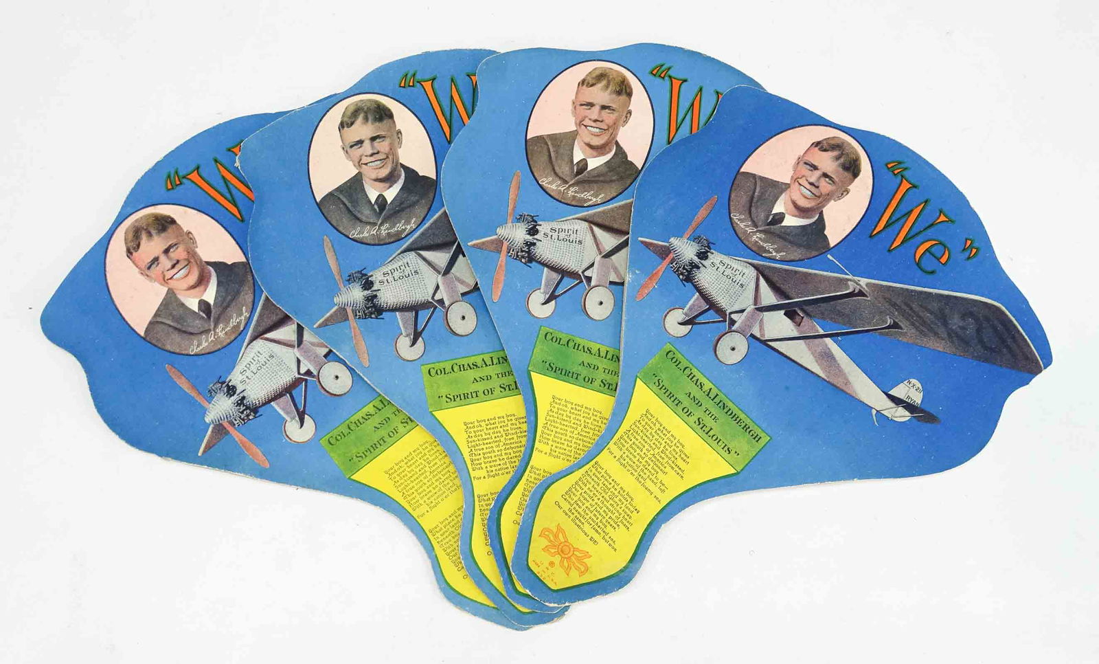 SoldCharles Linddbergh FansLot (4) C. 1927 cardboard Charles Lindbergh Spirit of St. Louis fans. 11 1/2" L..See Sold Price
