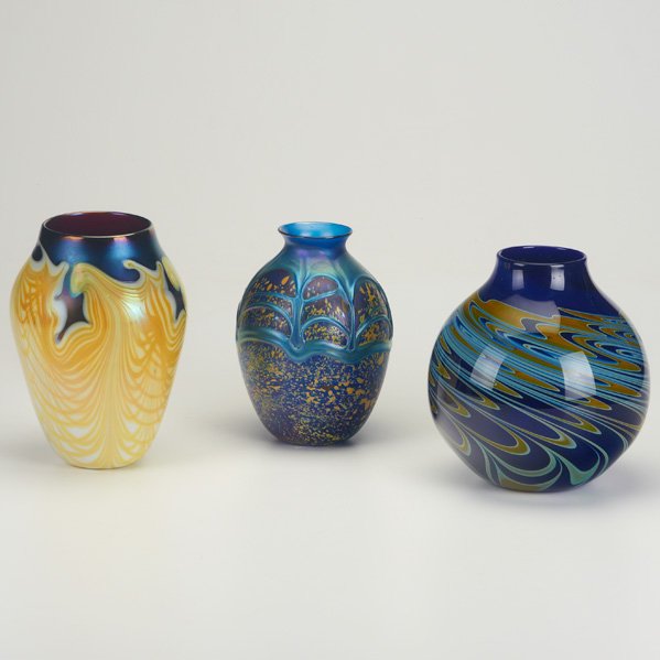 SoldCHARLES LOTTON FEATHER GLASS VASE.Signed and dated "Charles Lotton, 2000". Blue iridescent ground with feather design. 15.5"h.See Sold Price
