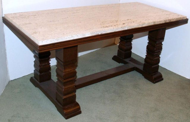 WOOD AND TRAVERTINE TOP DINING TABLE C 1970. DISMANTLES FOR TRANSPORT.Kamelot Auctions4.4(346)$4004 days Left