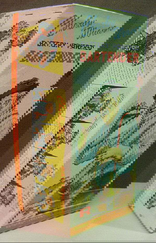 SoldBattery Operated Toys LotIncludes Charlie Weaver, fully functional, missing shaker top, light rust in battery box; Boxed bartender, fully functional, but has broken battery box latch, ob with insert; Robot, tin & plastic circSee Sold Price