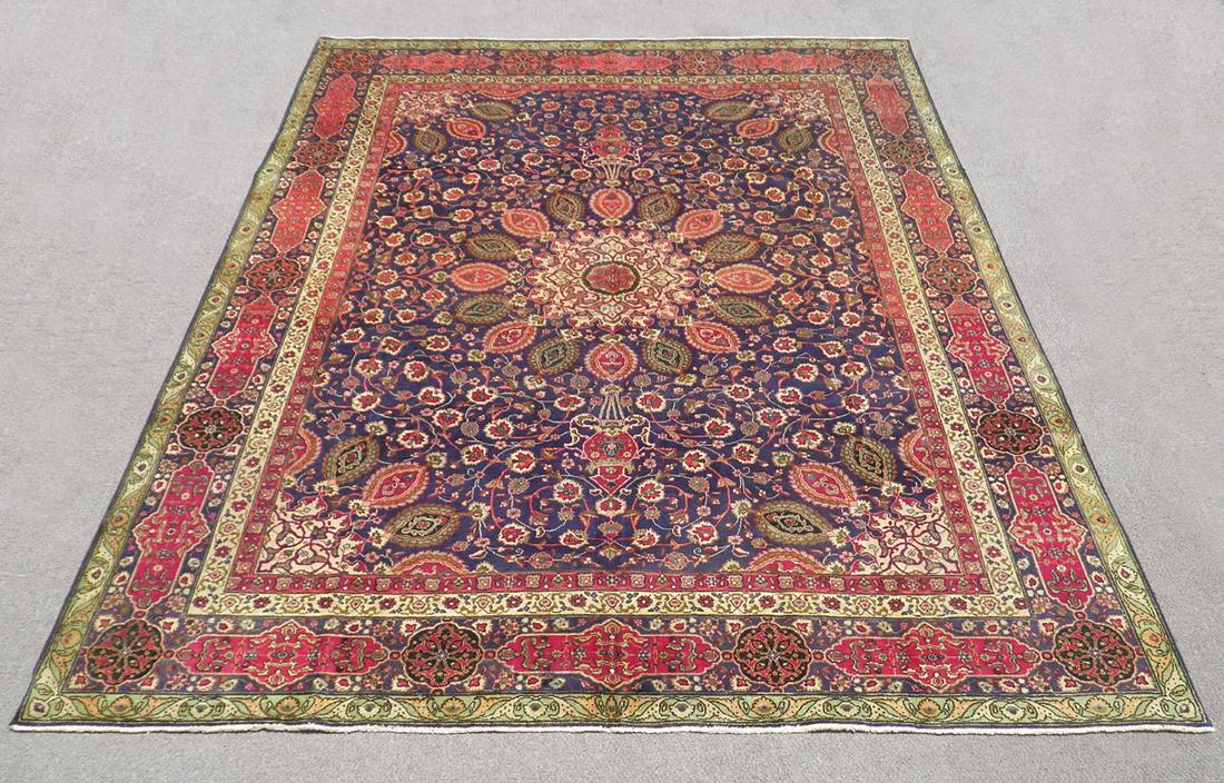 SoldSEMI-ANTIQUE PERSIAN TABRIZ HANDWOVEN WOOL RUG, C.SEMI-ANTIQUE PERSIAN TABRIZ HANDWOVEN WOOL RUG, C. 1960, W 9' 10", L 12' 8" Having a navy field with scrolling vine designs.See Sold Price