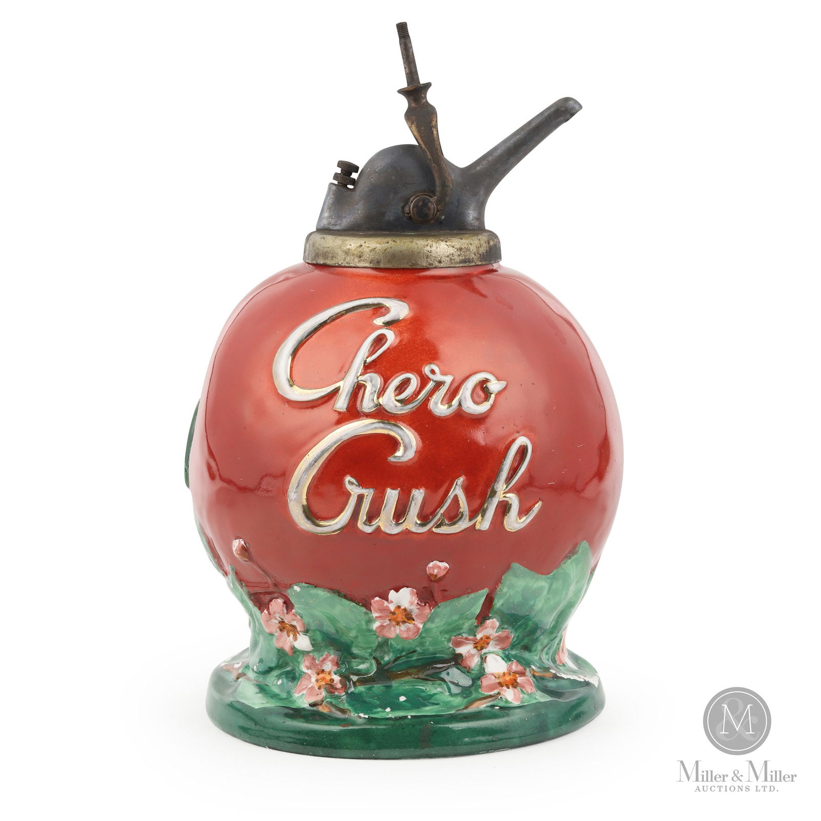 SoldCHERO CRUSH SYRUP DISPENSER.This dispenser is embossed and figural with an old ball pump. It is an absolute rarity and displays quite beautifully. There are a couple touched-up chips on the bottom edge of the base and the "CheroSee Sold Price