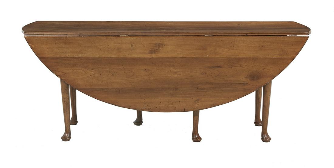 SoldLARGE CHERRY DROP LEAF DINING TABLE19th c. Oval Wake Table, with visible early hand planing marks to top surface with shaped apron, round tapered legs and pad feet, 30 1/4" high, 96" (8') x 22" (leaves down), 19 1/2" leaves. Surface weSee Sold Price