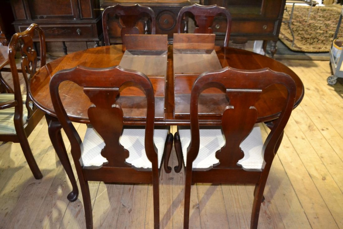 SoldSOLID CHERRY QUEEN ANNE STYLE DINING ROOM SETNICE SOLID CHERRY QUEEN ANNE STYLE DINING ROOM SET; TABLE W/ TWO SKIRTED LEAVES PADS & SIX CHAIRSSee Sold Price
