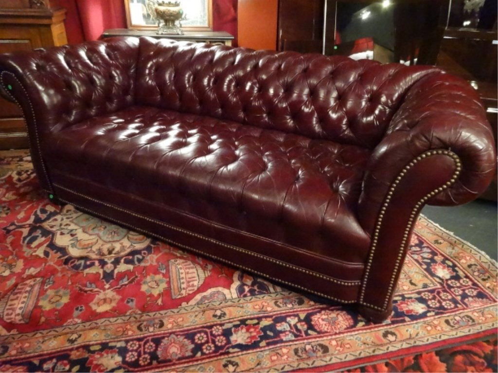 SoldENGLISH OXBLOOD LEATHER CHESTERFIELD SOFAEnglish Chesterfield style leather three-seat sofa, Winchester Furniture Company, 20th c., in oxblood button-tufted leather, with nailhead trim, having rolled arms, over three removable seat cushions,See Sold Price