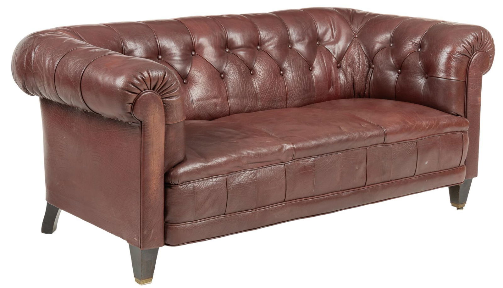 SoldChesterfield Tufted Burgundy Formal Leather SofaAntique style 20th Century Chesterfield formal burgundy red leather couch. Features tufted quality distressed leather upholstery with rolled wingback arms. Circa 1980's. No apparent label. SHIPPINGHilSee Sold Price
