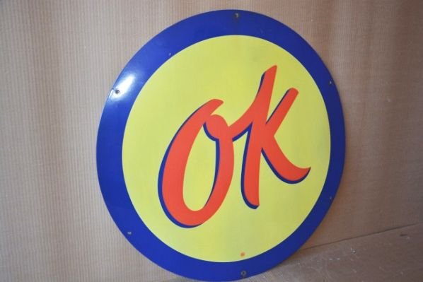 Sold(Chevrolet) OK Porcelain Sign (60") (TAC)rated 8.5, 60"D., SSP sign has very good color and gloss, has light wear, has a few chips in the field and around the perimeter, marked McAx. TAC #047448See Sold Price