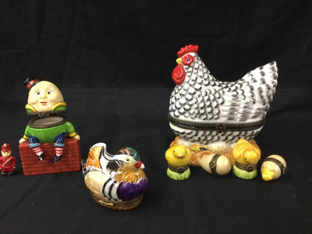 Lot Porcelain & Ceramic FigurinesMar 04, 2026Lot of Porcelain & Resin FigurinesMar 04, 2026Lot of Vintage Halloween and Thanksgiving Decor ItemsLot of Japanese Kokeshi DollsLOT OF GERMAN PUTZ FARM ANIMALS6 days LeftCandy Containers ~ Celluloid ++Feb 28, 2026VINTAGE FEMALE FIGURINE PORCELAIN FLORENZA LIMOGE ETC. DISCOVERY LOT21 hrs LeftOrnamented Porcelain egg(6) FABERGE STYLE JEWELED & ENAMELED EGG-FORM BOXES, 4 MUSIC BOXES2 days LeftDisney Donald Duck Don't Pull My Ears And Rumbling Donald DuckMar 02, 2026Three Chinese Ceramic Table Articles 4-1/2 x 4-1Mar 12, 2026A Pair of Chinese Porcelain Chickens7 hrs LeftMANIFATTURA ANTONIBON Two rooster-like tureens, Nove.Mar 05, 2026Papier Mache Chickens ~ Candy ContainerFeb 28, 2026Four Staffordshire Pottery Figures of RoostersMar 15, 2026Two Herend porcelain bird groupsMar 10, 2026