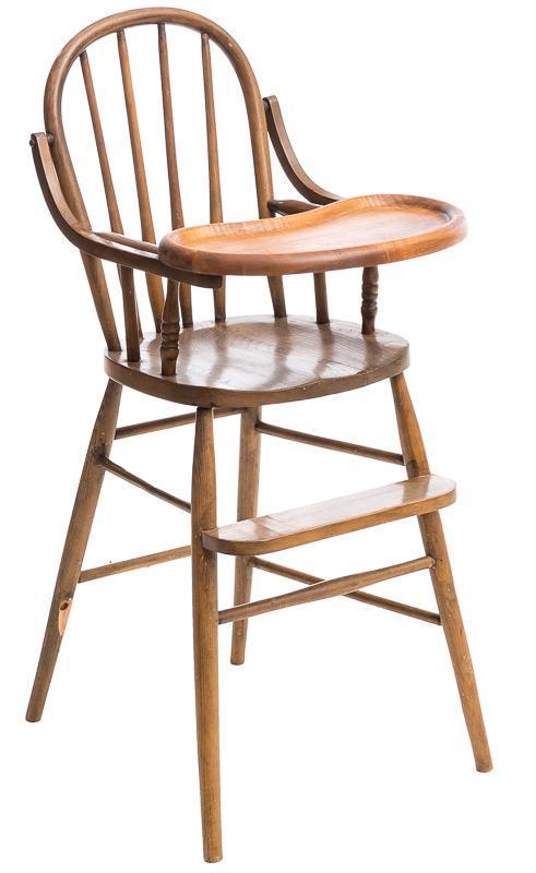 A primitive early American child's high chair with traces of original blue paint, turned and splayedA primitive early American child's high chair with traces of original blue paint, turned and splayed legs with cross stretchers and appears to retain original woven cane seat, circa mid 18th century o
