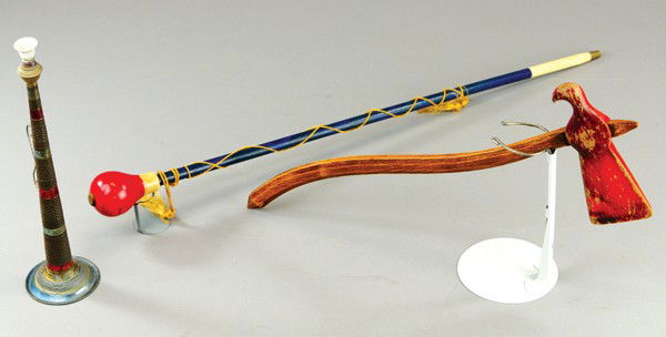 Sold6 Antique Tin Country Items - Patriotic Painted Parade Horns , Painted Shaker, etc.Including nice patriotic painted parade horns, small tin blue child's wash bucket, 2 alphabet plates, green painted nice salt or spice shaker.See Sold Price