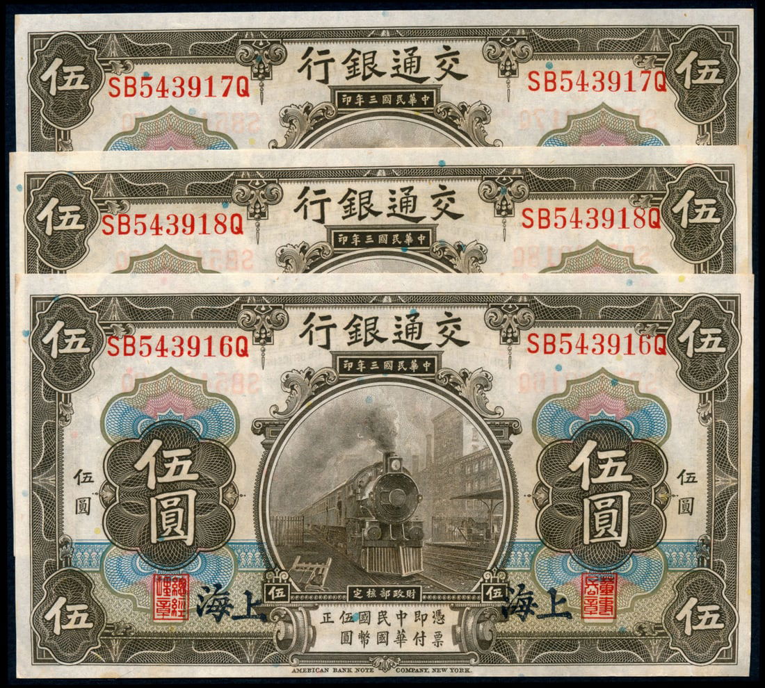 China 1000 Yuan 1945 PMGApr 10, 20261942 100 Yuan China Bank of Communications PMG AU556 days LeftChina 10 Yuan 1941 PMGApr 10, 20261914 5 Yuan China Bank of Communications PMG AU55 Certified Note5 days Left1941 100 Yuan China Central Bank of Pick# CHN243a PMG AU55Apr 01, 20261927 Bank of Communications 1 Yuan, Shanghai issue with train vignetteApr 26, 2026China 1914 Bank of Communications 5 Yuan Shanghai Issue, Locomotive and Bank Building Design, ABNC EMar 29, 20261914 China Bank of Communications Shanghai Five Yuan Serial SA579542CMar 29, 20261914 China Republic Bank of Communications 5 Yuan Shanghai Serial SA213757UMar 29, 20261927 China 1 Yuan, Bank of Communications, Shanghai Issue, Train DesignApr 26, 2026