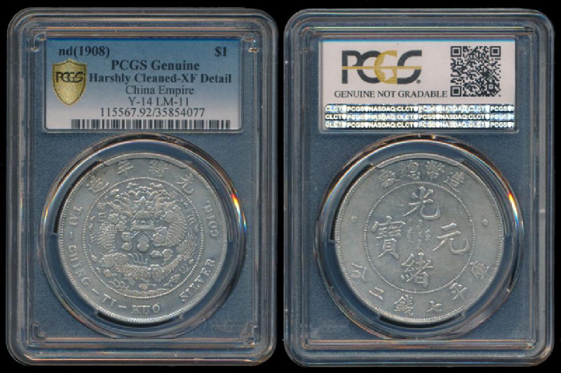 SoldChina Empire $1 1908 PCGSChina Empire, General Issue, Dollar, (Y.14; L&M-11), 1908, PCGS Genuine, XF Detail - Repaired.See Sold Price
