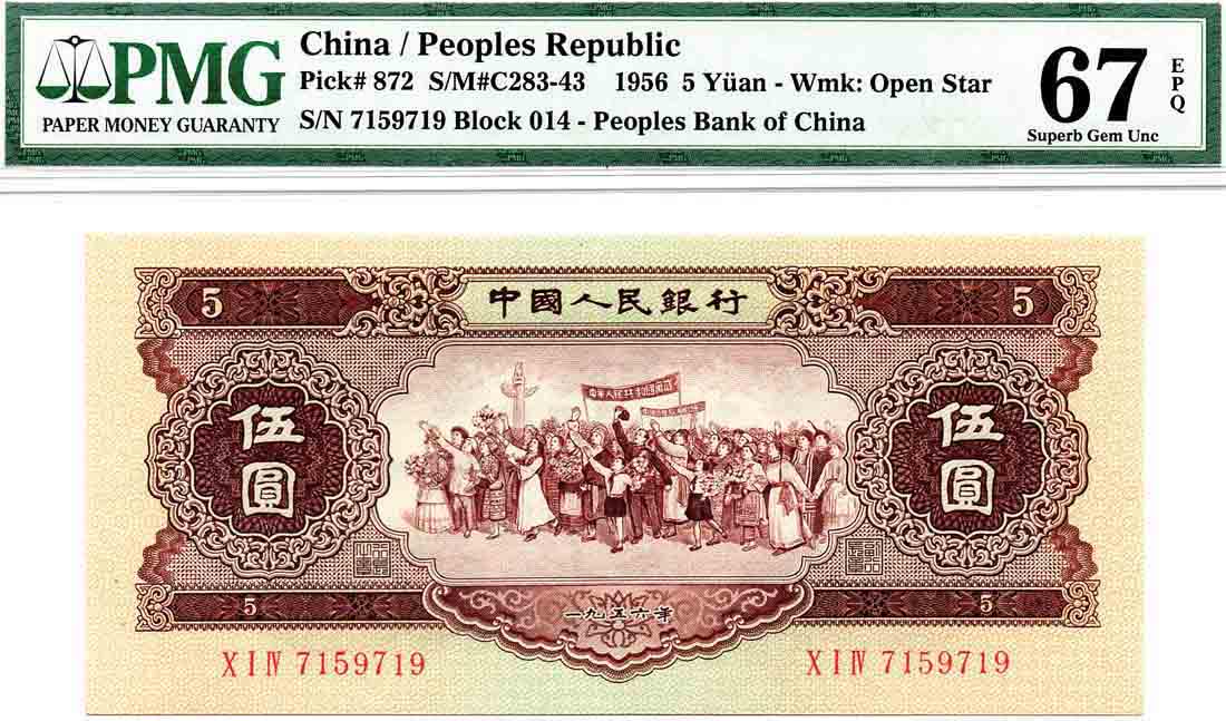 SoldChina,People's Republic 5 Yuan 1956China,People's Republic 5 Yuan 1956 (P872) Serial no:IVII 7364474 PMG 67EPQSee Sold Price