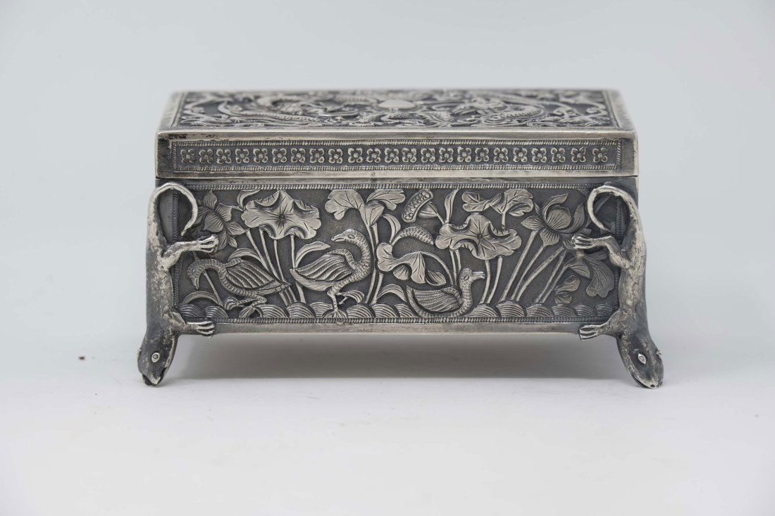 Chinese Antique Solid Silver Dragons And Bat Box