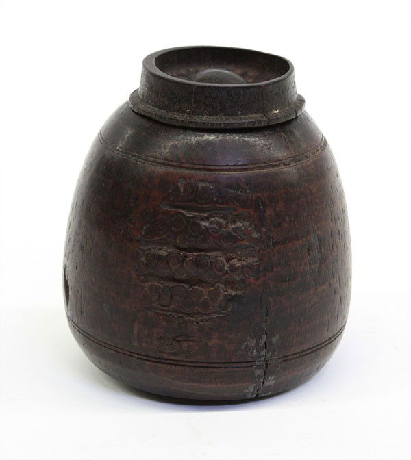 SoldCHINESE BAMBOO VENEER WALL VASEQing Dynasty period. Of ovoid form supported on a short splayed foot, rising to a waisted neck, the body carved with bands of archaistic scrolls and plantain leaves, the neck decorated with ruyi shapeSee Sold Price