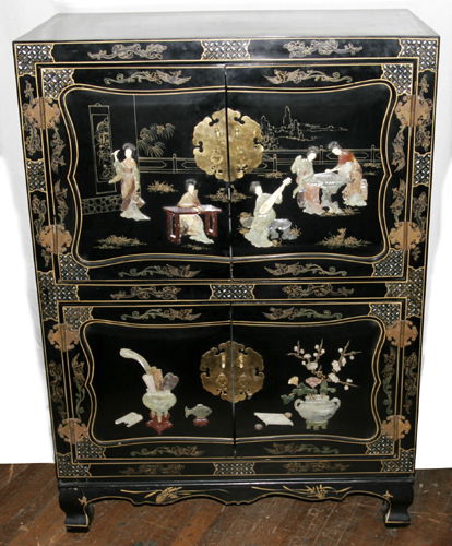 CHINESE BLACK LACQUER 2 PART CABINET, 20TH CENT