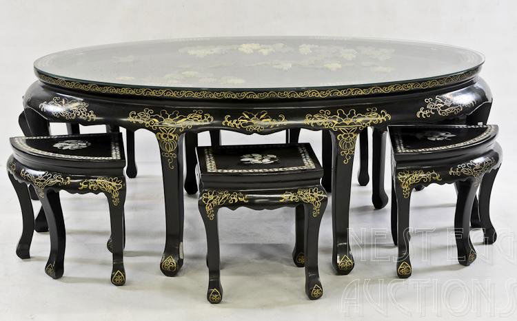 (4) ENGLISH REGENCY STYLE BLACK LACQUER CHINOISERIE NESTING TABLES20 hrs LeftChinese Heavily Carved, Occasional Tables or Pedestals, Teak, Marble, 1920sNeoclassical Style Ebonized Writing Desk6 days LeftEbonized Marble Top Coffee Table / Cocktail Table On Wheels manner of JansenMaison Jansen Louis XVI Dining Table, Conference, Ebony, Bronze, French, 1930sPair of French Rams Head Gueridon, End or Side Tables, Black Marble Top, BronzeA Chinese Export ebonized wood writing tableMar 03, 2026Hollywood Regency Black Gilt Coffee Table with Chinese Calligraphy Ming Feet3 days LeftHollywood Regency Black Gilt Coffee Table with Chinese Calligraphy Ming Feet19 hrs LeftA Japanese inlaid ebonized wood tableMar 03, 2026Chinoiserie Gilt and Black Lacquered Low TableApr 07, 2026A BLACK AND GILT CHINOISERIE LAQUERED CENTER TABLE, THE TOP POSSIBLY 18TH CENTURY, THE STAND LATERBlack Lacquer Ming Coffee Table with Gold Floral Egret Design3 days LeftCUSTOM PAINTED OVAL COFFEE TABLE2 days LeftMahogany Dining Table with Glass Top in Duncan Phyfe Style4 days LeftChinoiserie Black Lacquered Gilt Accent Tables Pair7 days Left