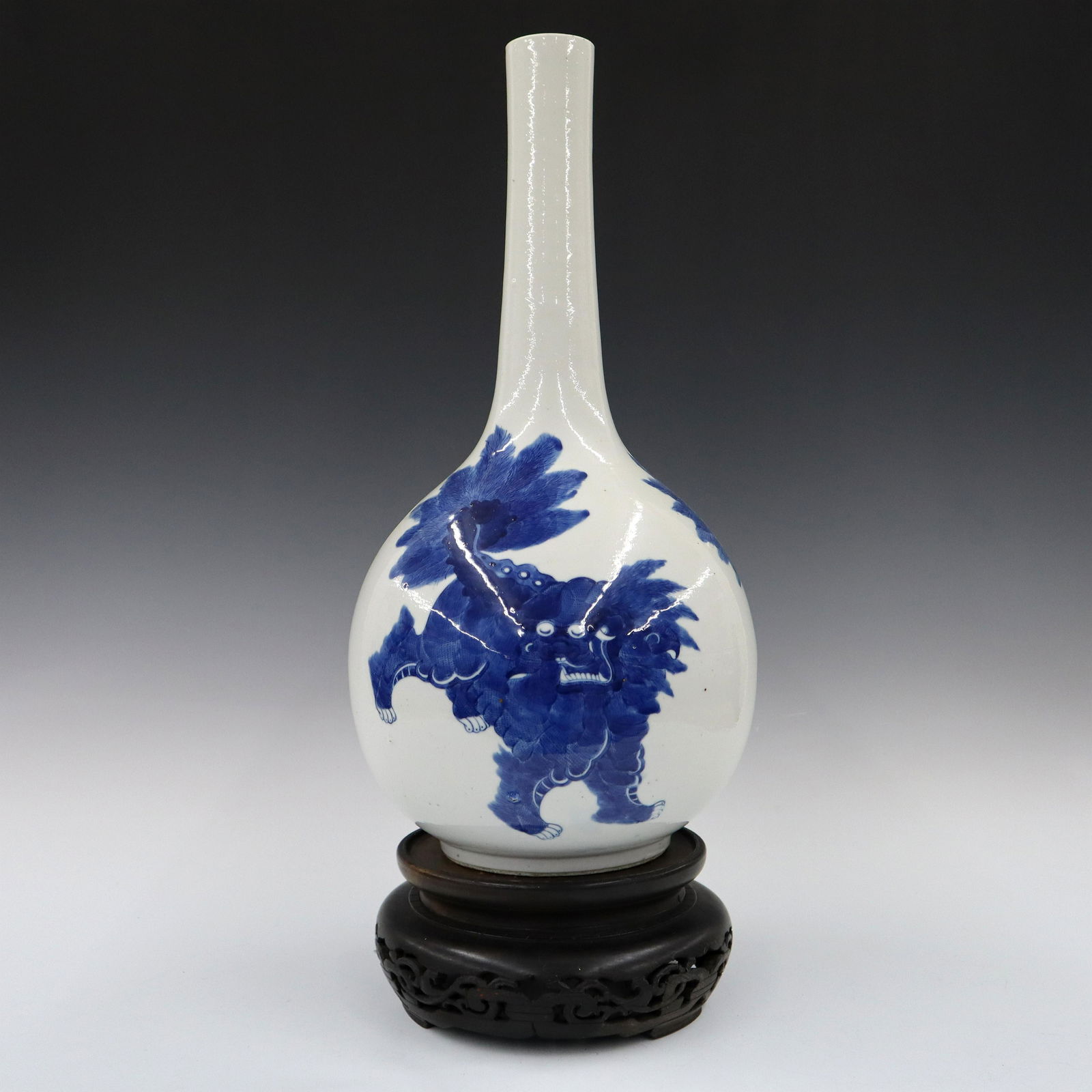SoldCHINESE BLUE & WHITE VASE W/ QILIN & FU LIONS(2 pcs) Chinese blue and white vase with a wooden stand, the vase having a short standing rim with a band of crashing waves, surmounting a shouldered tapering form having a band of ruyi cartouches conSee Sold Price