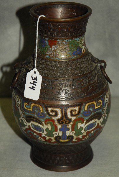 Sold(4) Asian Pieces(4) Asian pieces, Japanese bronze & champleve vase with stylized animal handles, small Japanese cloisonne vase, Chinese cloisonne vase with Thousand Antiques decoration, Chinese iron with hard stone hSee Sold Price