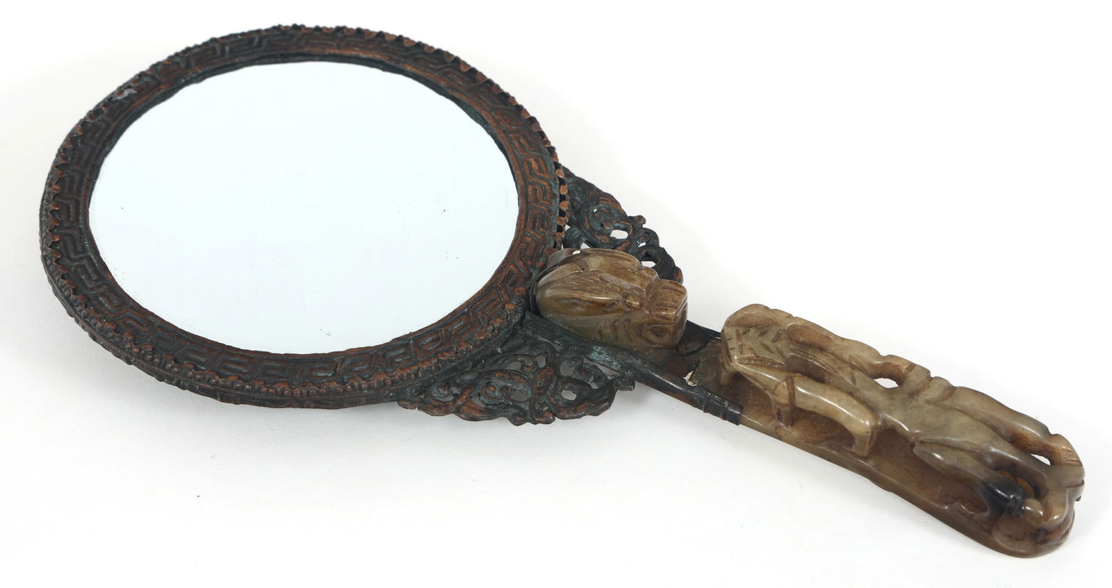 CHINESE BRONZE & SOFTSTONE HAND MIRROR