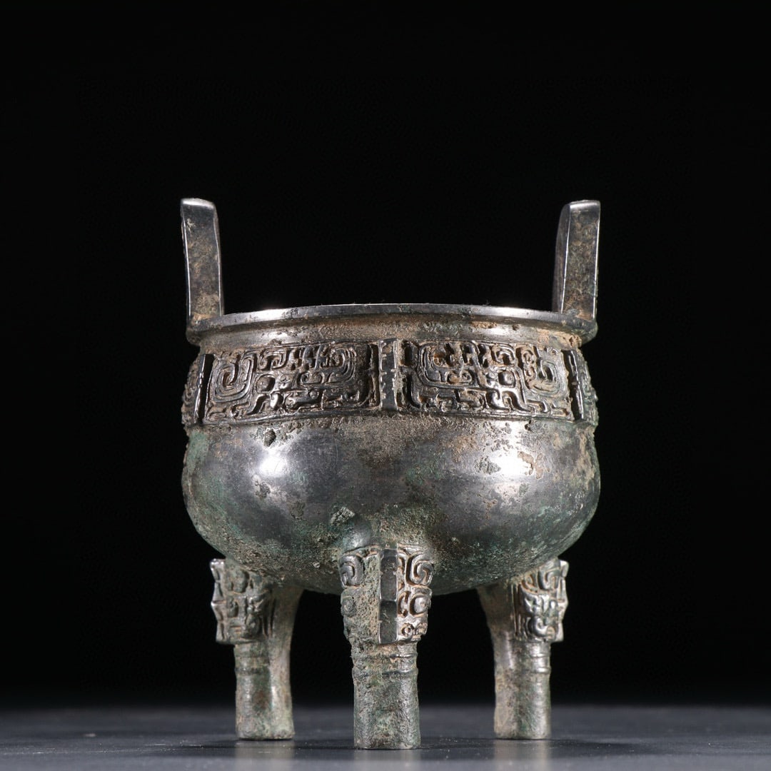 Chinese Bronze Carved Beast Face Pattern Double Ears Ding