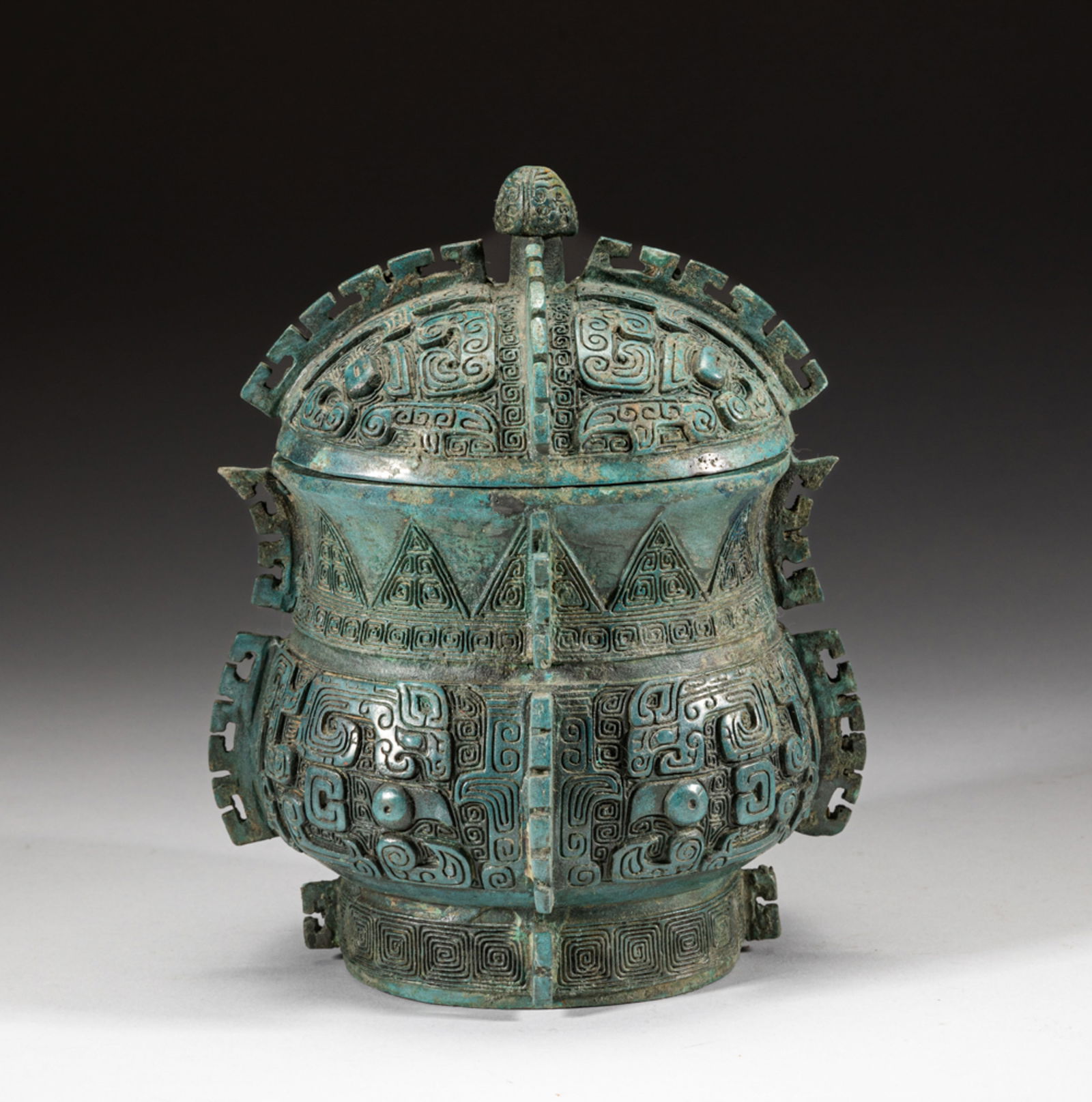 SoldChinese Archaistic Bronze Covered VaseChinese archaistic bronze double-form covered vase with various animal forms and allover detail work; overall good condition; H 12 3/4" x W 10 1/4" x D 4 1/2" (approx.)See Sold Price