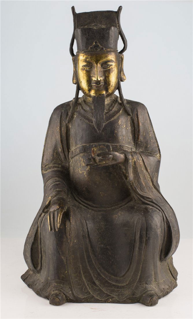 SoldAntique Chinese Ming Bronze Seated FigureDESCRIPTION: An antique Chinese bronze seated figure of the God Wenchang Wang, (Daoist god of literature and culture) in draped robe on throne, holding a tablet at chest. Features dark patina with gilSee Sold Price