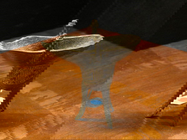 SoldARCHAIC STYLE CHINESE BRONZE LIBATION VESSEL 8"ARCHAIC STYLE CHINESE BRONZE LIBATION VESSEL (JUE) – TRIPOD RITUAL FORMFINE EXAMPLE OF A JUE-FORM BRONZE LIBATION VESSEL, FEATURING A FLARED SPOUT, RAISED DECORATIVE POSTS, AND INCISED TAOTIE MASK DSee Sold Price